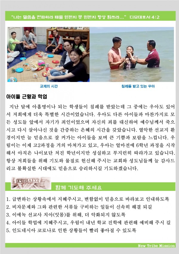 최근에 보내주신 선교사님 가정의 소식입니다.
