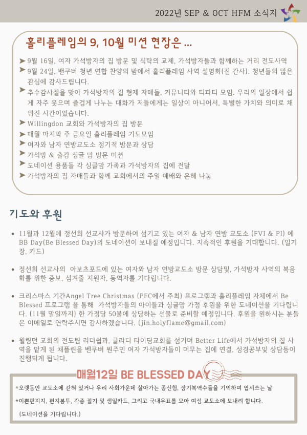 홀리플레임 정선희 선교사님 소식(11월 2022년)