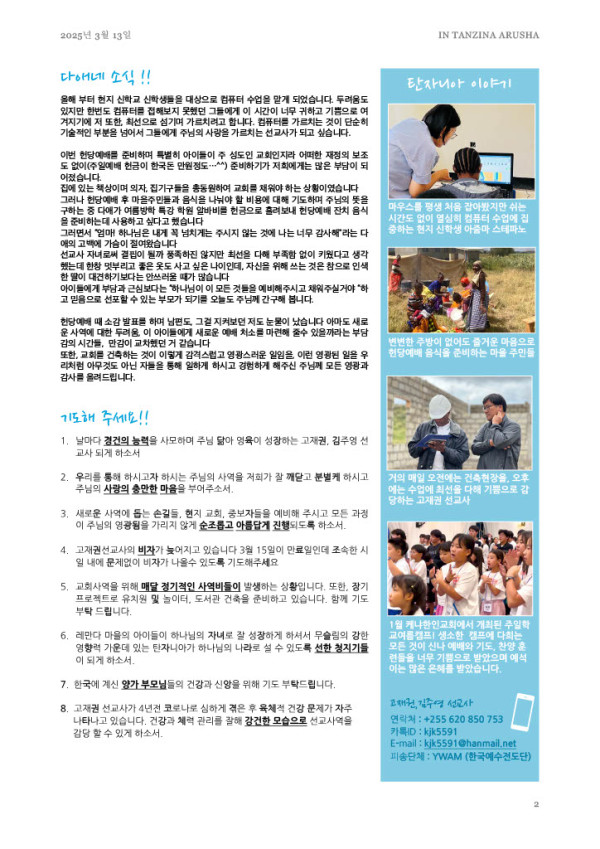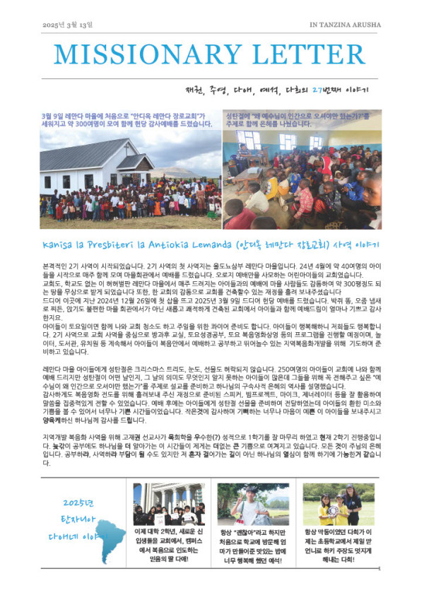 고재권/김주영 선교사 가정 선교 편지 페이지 정보 작성자 밴쿠버예수비전 댓글 0건 조회 721회 작성일 25-03-13 18:01 목록 본문 함께 기도로 아뢰어 주세요! Preach the Word!Reach the World! 이전글인도네시아 이재호 선교사님 선교소식 25.05.19 다음글인도네시아 이재호 선교사님 연말 선교소식 24.12.24 댓글 0 댓글목록 등록된 댓글이 없습니다. 목록